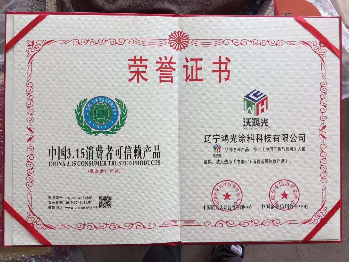 沃鴻光無機(jī)涂料被評(píng)為中國3.15消費(fèi)者可信賴產(chǎn)品
